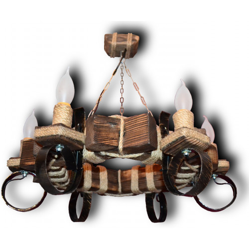 Люстра подвес на 6 ламп. Изготовленна из натурального дерева. С добавлением элементов металла и ткани