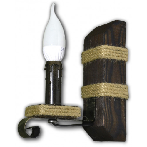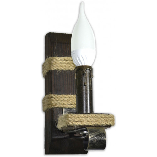 Ярко выраженная фактура обработанного дерева, открытые лампы в форме пламени свечи. Образ старины дополняют патроны, стилизованные под «оплавленный воск». Только эти свечи задуть не удастся. Люстры управляются настенным выключателем. Декоративный льняной канат «поддерживает» конструкцию.