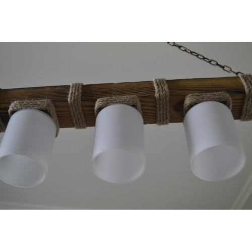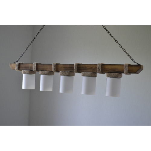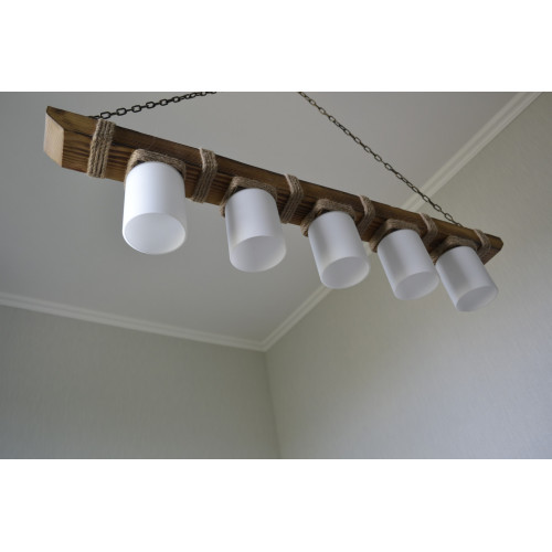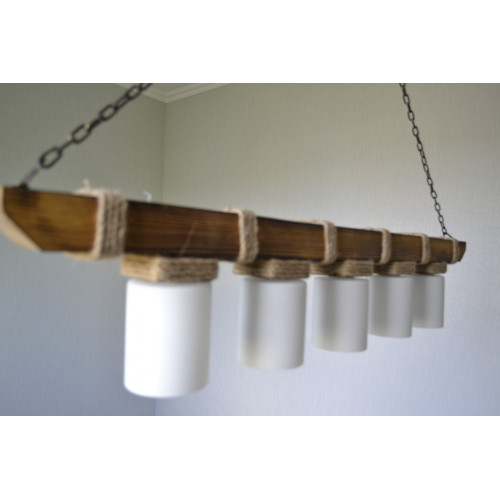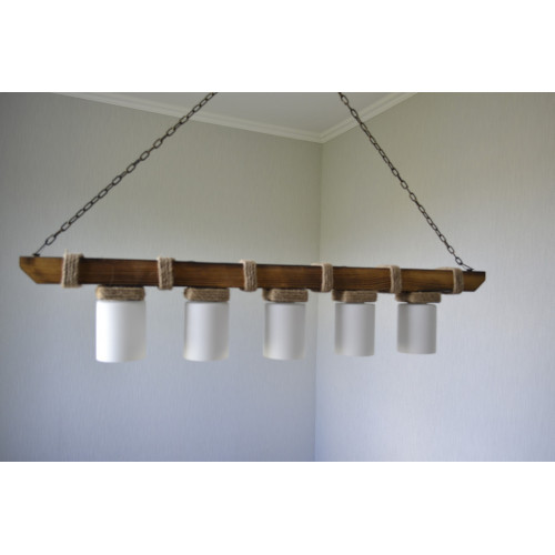 Стильная и практичная люстра из натурального дерева. Применяется для общего и локального освещения в жилых комнатах, кафе, ресторанах, а также для освещения деревянных альтанок, беседок. Декорирована джутовым канатом и укомплектована стеклянными плафонами молочного цвета. Длина деревянной балки для этой модели 60 см. Сечение балки 60/40 мм. Плафон бочонок стекло матовое, под лампу с цоколем Е 14/ евро стандарт /, 80/65 мм. К заказу доступны разные варианты окраса , размеров и различные плафоны. Отправки Новой Почтой или самовывоз.