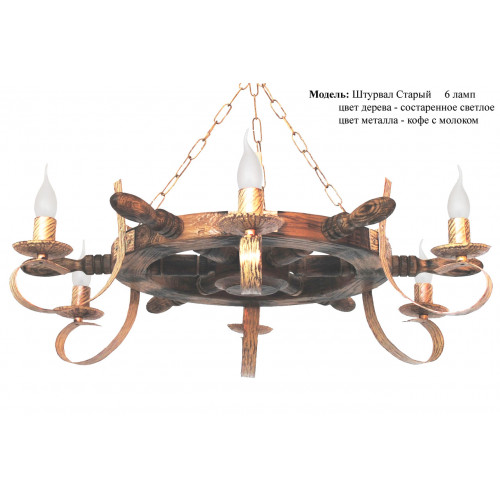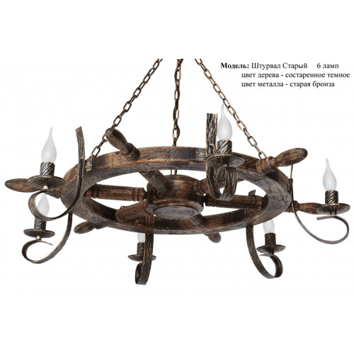 Замечательная серия люстр из натурального дуба стилизованных под состаренное штурвальное колесо. Отличные материалы и исполнение, художественная ковка. Оптимально в комплекте с светодиодными лампами свеча на ветру. Изготовление 2-15 дней.